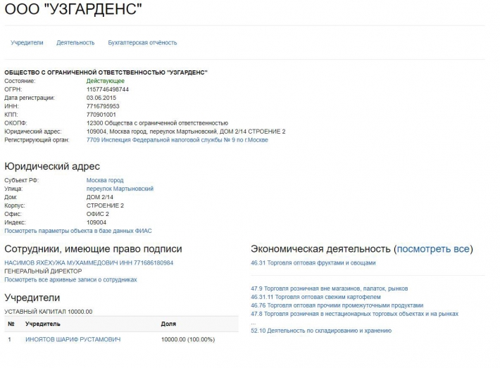 3 июня 2015 года Шариф Рустамович Иноятов основал Uzgardens, российскую компанию с ограниченной ответственностью, специализирующуюся на оптовой торговле фруктами и овощами. Юридический адрес Uzgardens: Москва, 2-й Мартыновский переулок. Будучи единственным акционером компании, сын Рустама Иноятова имеет право на всю прибыль Uzgardens.