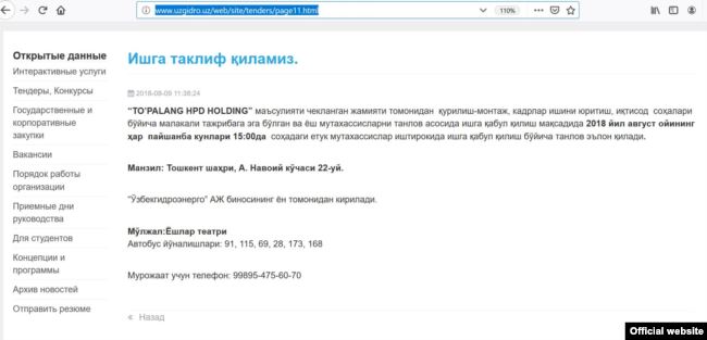 Госкомпания «Узгидроэнерго» дает объявление о приеме на работу в ЧАСТНУЮ компанию сына своего руководителя