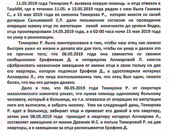 «Совершенно непонятно, на каком основании Учтепинский суд принимал решение о введении Темировой в права наследования на эти квартиры и почему судья Имомов взял на себя функции нотариуса и всё решил за него? Ведь это абсолютно незаконно, - указывают сестры. – Темирова знала и понимала, что у Ивана Древняка есть законные наследники, это мы, его дочери, что мы будем претендовать на наследство, что будем оспаривать сфабрикованные ею завещания, поэтому она и торопилась. Суд обязан был отправить Темирову в ГНК для оформления наследства, а не заниматься беспределом. (Она должна была ждать полгода, а судья Имомов, в обход нотариальной конторы, незаконно ввел ее в права наследования сразу – ред.).