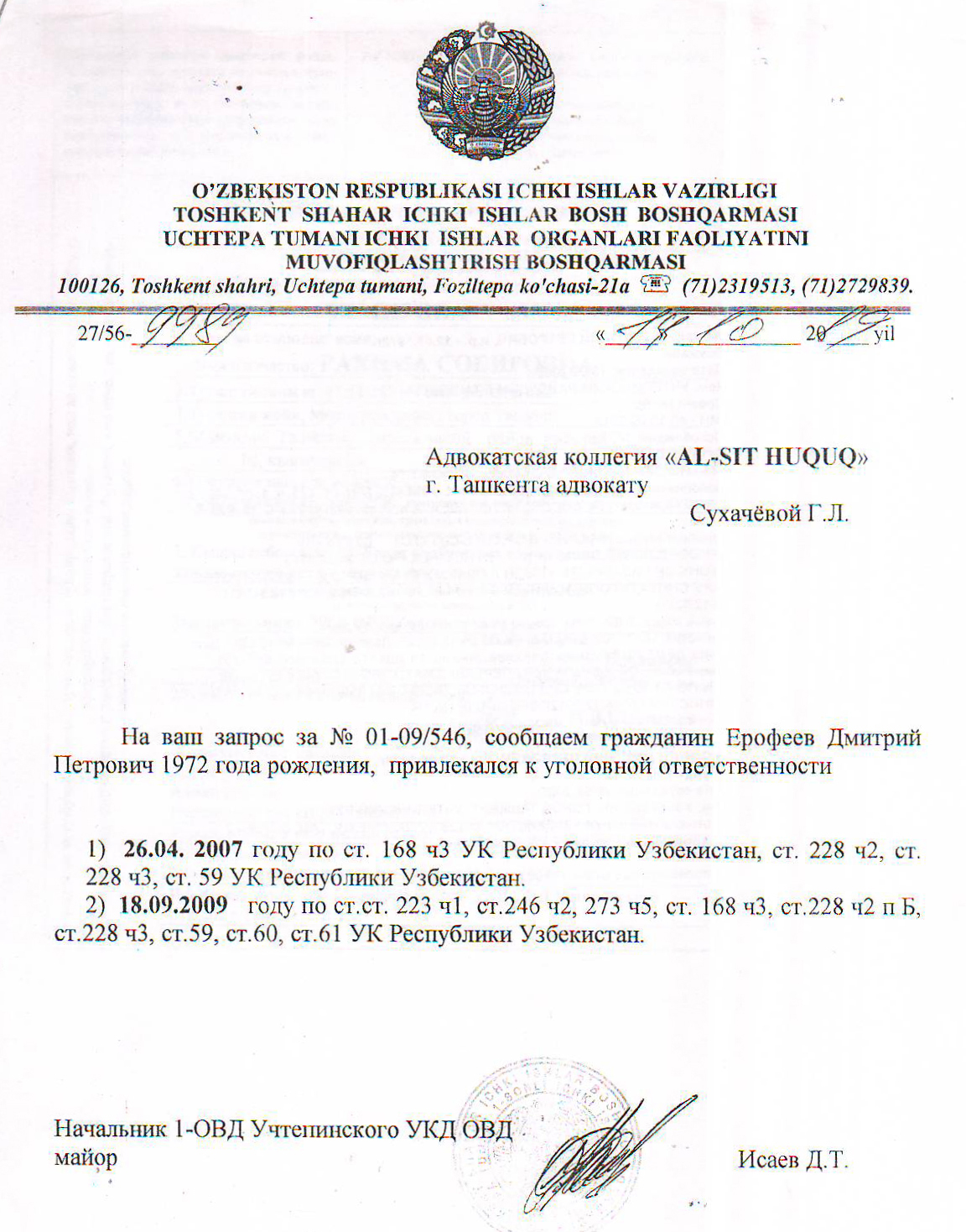 Так, из управления юстиции г. Ташкента пришел официальный ответ, что ГНК №-5 Чиланзарского района столицы БЫЛА ОБЕСПЕЧЕНА НЕОБХОДИМОЙ ТЕХНИКОЙ. То есть, как и предполагалось, представители РУВД Учтепинского района намеренно лгали. К сожалению, эта ложь осталась без последствий.