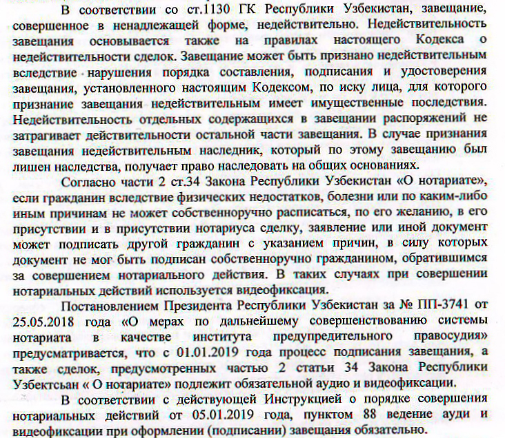 Без должной оценки судья оставил и то, что нотариус Аллаярова проигнорировала постановление президента Шавката Мирзиёева «О мерах по дальнейшему совершенствованию системы нотариата в качестве института предупредительного правосудия» от 26 мая 2018 года, закон «О нотариате» и Инструкцию о порядке совершения нотариальных действий, предусматривающие обязательную аудио- и видеофиксацию подписания завещаний.