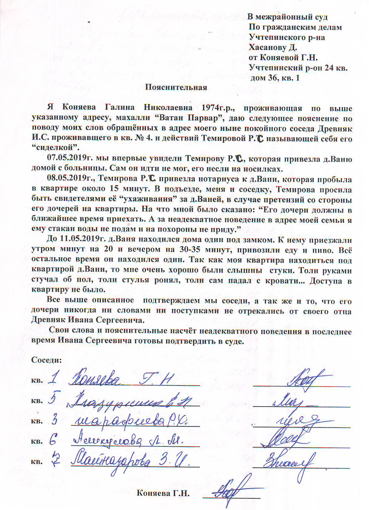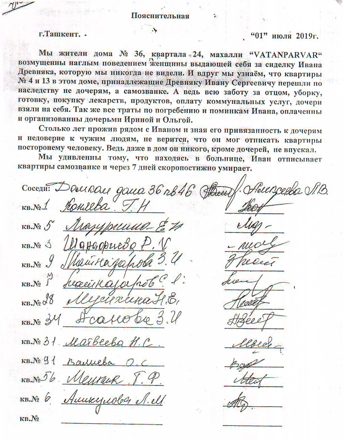 Пояснительное письмо соседки И.Древняка