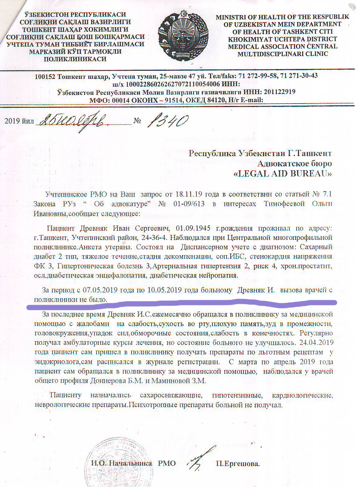 Ответ от медицинского объединения Учтепинского района Ташкента