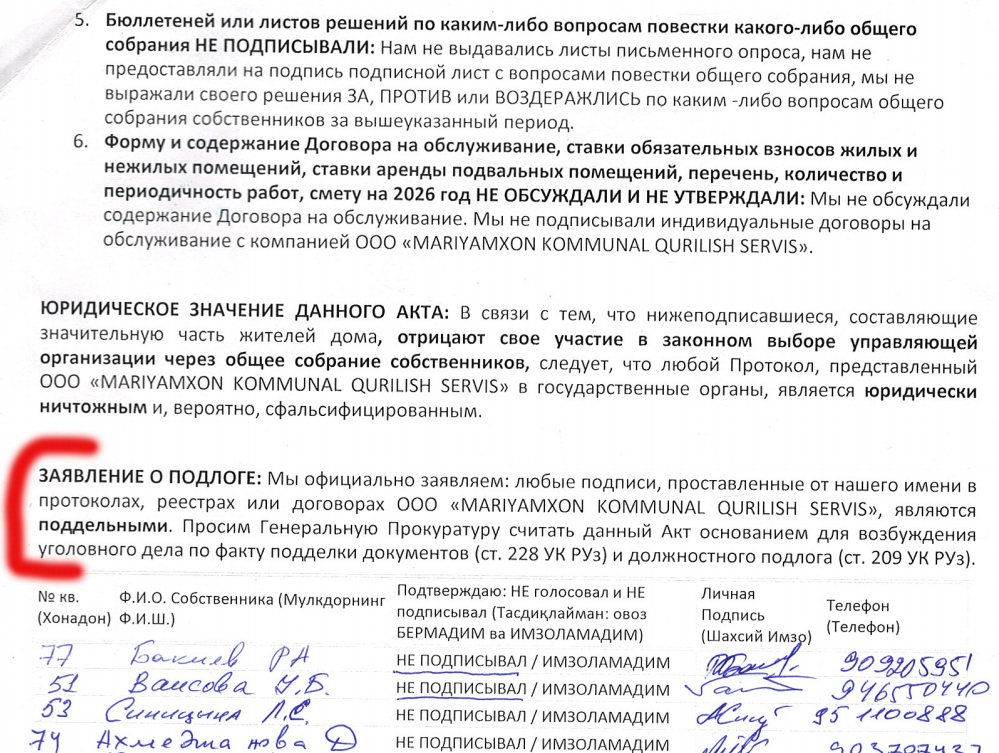 Мы не сидели сложа руки, а направили десятки обращений во все возможные инстанции: Яккасарайский хокимият, прокуратуру, МинЖКХ, Инспекцию... Но вместо конструктивного диалога и правовой оценки столкнулись с глухой стеной бюрократии. На все наши запросы приходят стандартные, написанные как под копирку «отписки». Ведомства пересылают наши жалобы друг другу, создавая бесконечный замкнутый круг, в котором суть проблемы теряется за формальными фразами «всё проведено согласно регламенту». Нас словно не хотят слышать, игнорируя коллективное мнение большинства жителей.