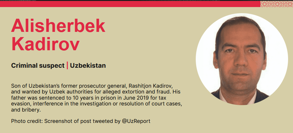 Издание утверждало, что сын генпрокурора Кадырова владеет частной адвокатской конторой «Консул», консалтинговыми фирмами, сетями магазинов класса люкс Bang&Olufsen, Choppard, Svarovski и Montblanc, а также несколькими торгово-развлекательными комплексами [Флагман] (имеется в виду – в Ташкенте и областях Узбекистана – ред.). Помимо прочего, он контролирует весьма специфический и в высшей степени прибыльный теневой рынок услуг, представляющий собой решение проблем состоятельных граждан, столкнувшихся с репрессивной прокурорской «машиной». Цена вопроса – от $200 тысяч до $20 миллионов.
