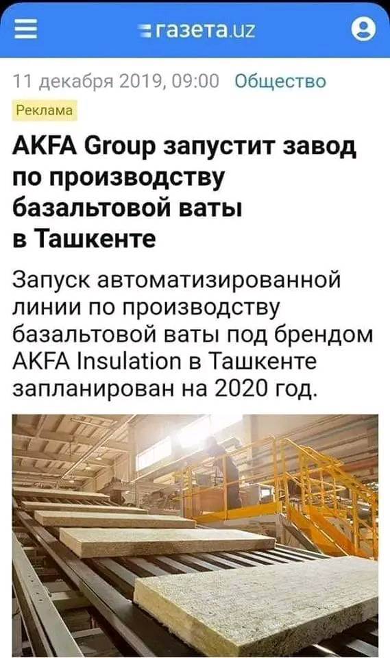 «5 декабря в ходе переговоров AKFA Group и итальянской компании STM Technologies Srl. был заключен договор на поставку производственно-технологического оборудования по выпуску базальтовой ваты. Запуск нового завода, многолетний опыт работы в строительстве, высокоэффективная технологическая линия, специальная сырьевая база и удачное географическое расположение позволят AKFA Insulation стать надежным поставщиком и партнером для строительной индустрии не только в Узбекистане, но и Центральной Азии», - информировала Газета.uz в хвалебной публикации на эту тему.