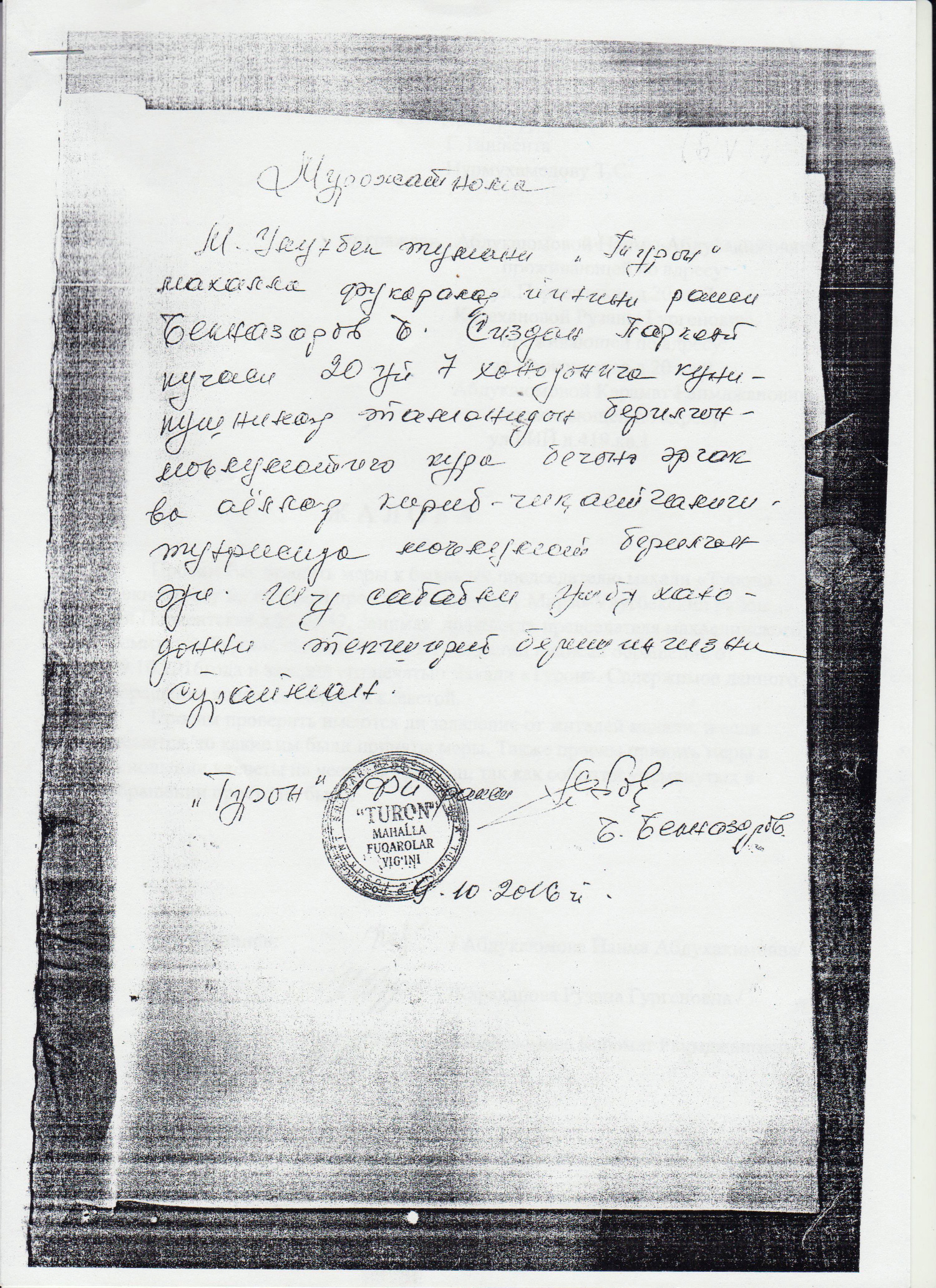 Оказалось, председатель махалли Бекназаров направил два обращения в милицию – от 8 и 9 октября, через неделю после того, как Гузаль Абдувалиева сняла у дочки жильё, – что в этих двух квартирах – моей дочери и расположенной неподалеку от нас, в одиннадцатом доме, – действуют притоны. Что их посещают незнакомые люди, и что об этом будто бы сообщают соседи.