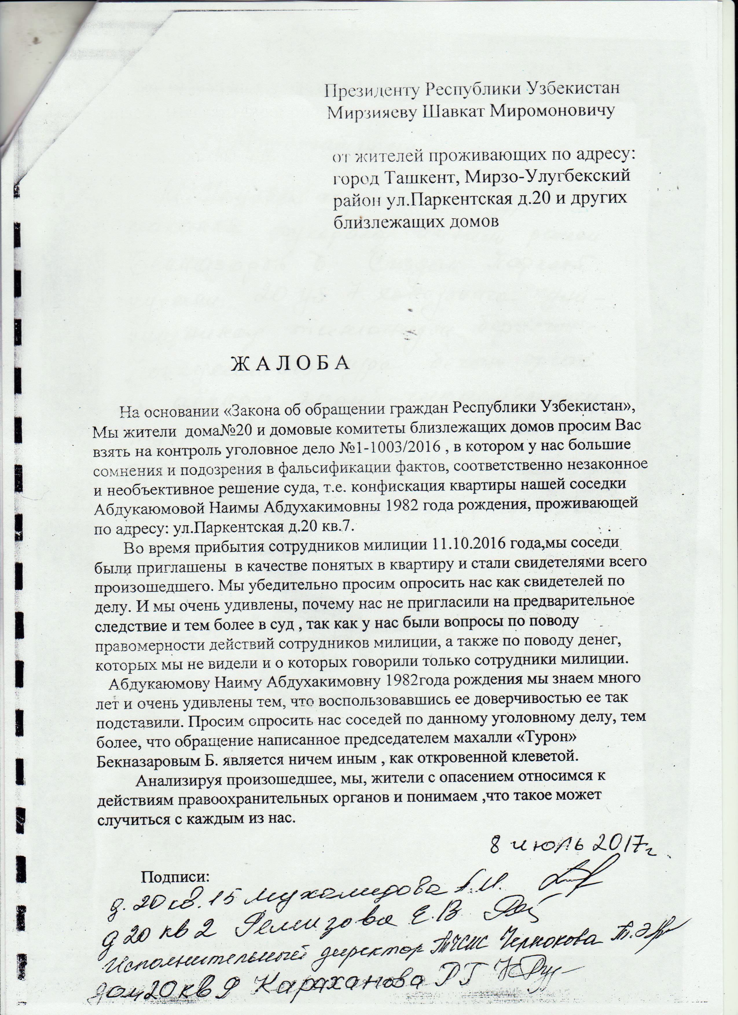 «У моей дочери Наимы Абдукаюмовой конфисковали её единственное жилье – однокомнатную квартиру в Мирзо-Улугбекском районе столицы. Адрес: улица Паркентская, дом 20, квартира 7. В ней она жила с 2005 года. Эту квартиру мы никогда не сдавали, она ее хозяйка и сама была в ней прописана. Это хорошее место, близкое к её работе, - она оператор на 069, это справочная аптек, - и ни днем, ни ночью там не страшно. Соседи относятся к ней с уважением.