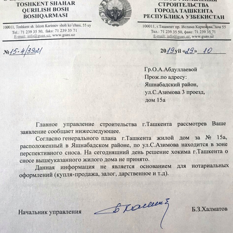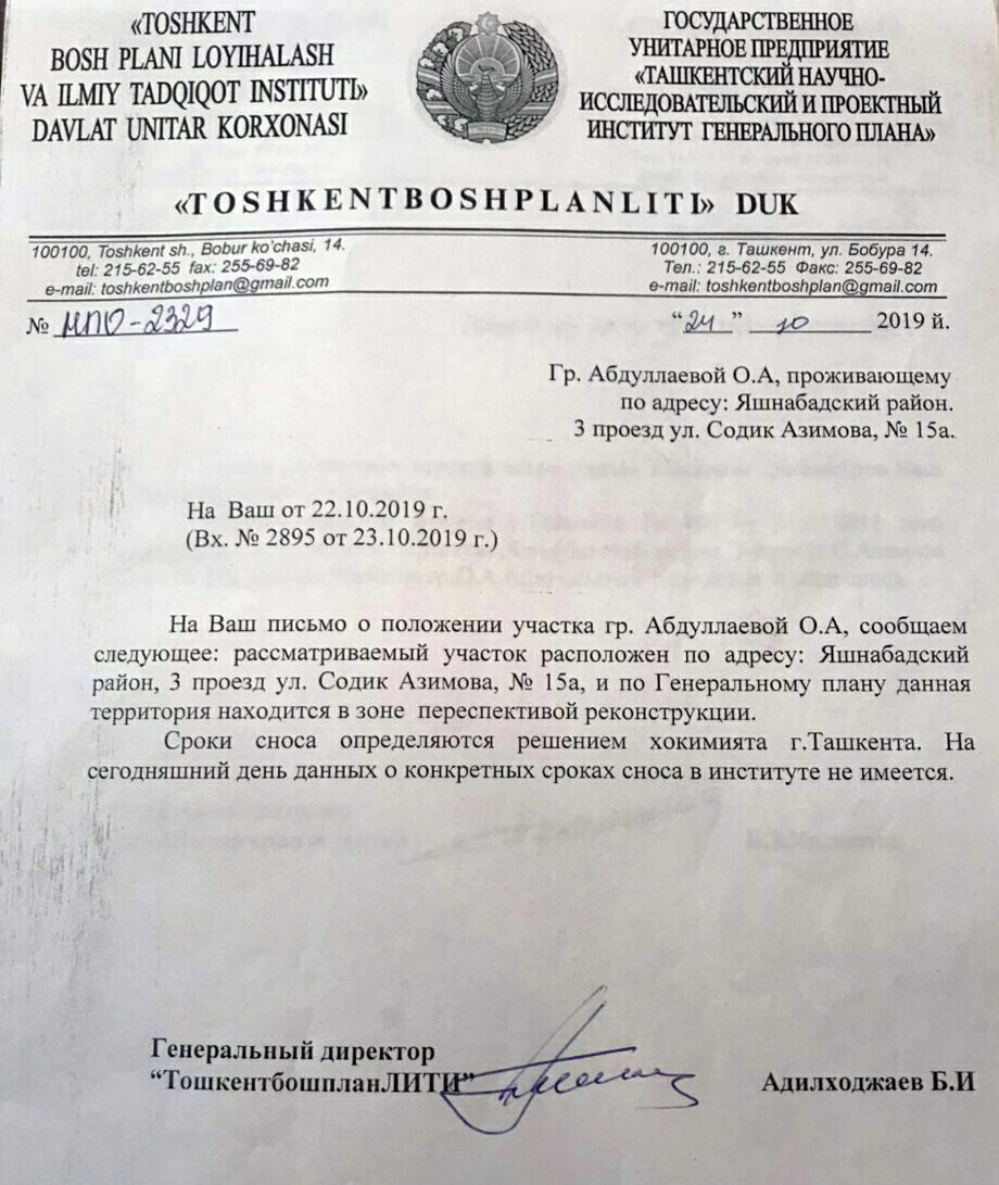 Примечательно, что даже в таком решении хокима дом Абдуллаевой не был отмечен в зоне сноса.