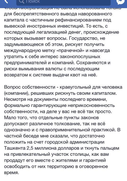 Никто не против обновления города, красивого благоустроенного Ташкента, но реально красивого, а не забитого вплотную муравейниками, высотками, однотипными современными бараками, без зелени и воздуха. И почему люди, так долго ожидавшие светлых времен, глотка свободной жизни, достатка, не предавшие свой город, не уехавшие, любящие родину и родные места, сейчас чувствуют себя беспомощными жертвами, под катком новой жизни, выброшенными, как ненужный балласт куда угодно, по дешевке, лишь бы не мешали... Не мешали чему? Благоустройству? А для кого оно, если город опутал страх, что будет. Копили деньги, покупали жилье, украшали быт, совсем в неблагополучных экономических условиях, и вот опять крах, выселение на окраину, стресс, потеря веры, инфаркты… А иначе, цивилизованно, с контролем бесчинств, нельзя это делать? Если у одних застройщиков нет денег расселить по-человечески людей, найдутся другие. Может, хокимам районов начать исполнять свои обязанности вместо выписывания разрешений под застройку кому попало, кто больше откат даст? Спешат? Время горячее, успеть срубить бабла? Народ у нас бедноватый, но его много, можно хорошо навариться» (Ирина Федосимова).