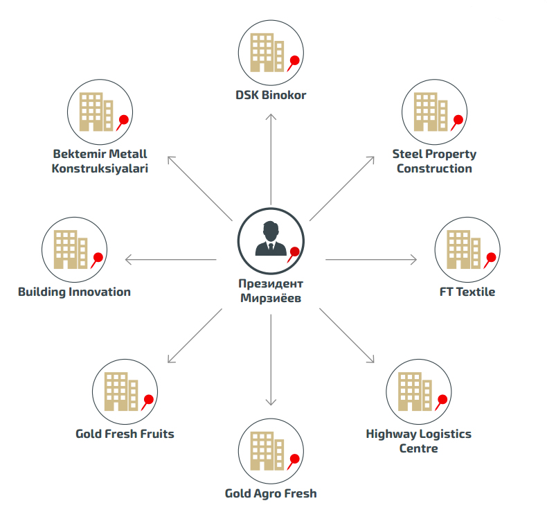 Проведенное расследование представляет собой самую обширную на сегодняшний день публичную информацию о бизнес-группе, связанной с семьей президента Узбекистана. Мы пересказываем его содержание, выделив полужирным шрифтом особо значимые места.