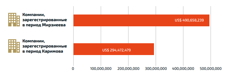 Что касается 58 предприятий из выборки, то уставный капитал 29 компаний, основанных до сентября 2016 года, в эпоху предыдущего президента Узбекистана Ислама Каримова (в основном 2010-2016 гг.), составляет 276,3 миллиона долларов (часть этого капитала могла быть внесена и после сентября 2016-го). Уставный капитал других 29 компаний, основанных уже после сентября 2016 года, при президенте Мирзиёеве, - 452 миллиона долларов. 26 из этих 29 компаний, с уставным капиталом в 432,9 миллиона долларов, были основаны в период с 14 декабря 2016 года по 12 декабря 2018-го.