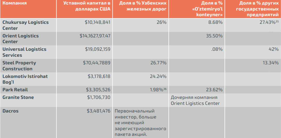 Эти крупномасштабные предприятия получили значительную государственную поддержку, в основном через акционерную компанию «Узбекистон темир йуллари» («Железные дороги Узбекистана» - ред.), владеющую и управляющую национальной железнодорожной системой, и ее грузовым подразделением «Узтемирйулконтейнер» («Узжелдорконтейнер» - ред.), а также ее дочерние предприятия, благодаря крупным контрактам и доступу к логистическим ресурсам. Всё это было предоставлено при непрозрачных обстоятельствах. (Председатель правления АО «Узбекистон темир йуллари» - Ачилбай Раматов, первый заместитель премьер-министра Узбекистана. О нем рассказывается в статьях «Вынесен приговор по делу о прорыве сардобинского водохранилища: приближенных президента Мирзиёева среди осужденных нет» и «Шавкат Мирзиёев построил личную «дачу» с водохранилищем в горах Ташкентской области за сотни миллионов долларов – расследование «Озодлика» – ред.)