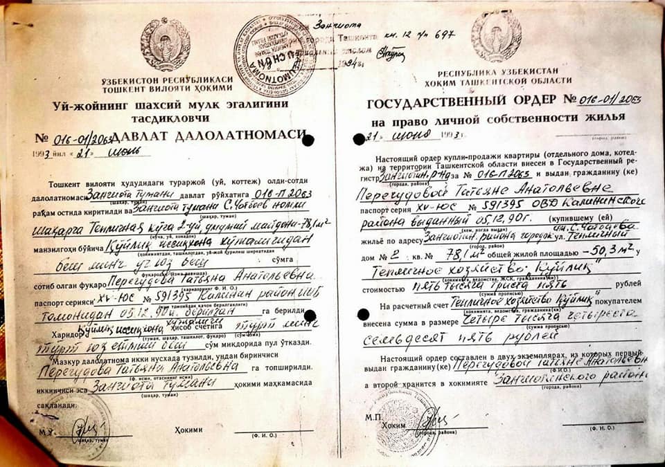 В 1993 году жильё было приватизировано. Татьяна выкупила дом у директора тепличного хозяйства «Куйлюк» Мехриддина Ахмедова (будущего главы частного предприятия «Агрофирма «Куйлюк»), на балансе которого он тогда состоял. У нее даже есть документ: приказ от 24 декабря 1992 года, изданный Мехриддином Ахмедовым - «О продаже в качестве частной собственности дома № 2, расположенного (называется адрес))»: «1. Находящийся в распоряжении тепличного хозяйства «Куйлюк» Зангиатинского района (…) частный дом №2 в котором проживает гражданка Перегудова Татьяна Анатольевна (…) ПЕРЕДАТЬ ЕЙ В ЧАСТНУЮ СОБСТВЕННОСТЬ. (…) Круглая печать. Подпись.