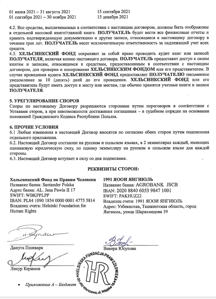 - Договор о предоставлении гранта подписан 7 июня 2021 года сторонами - директором Хельсинского фонда по правам человека, адрес: ул. Вейска 16, 00-490 Варшава, Польша, и «1991 ЯООИ ЯНГИЮЛЬ», адрес: Ташкентская область, г. Янгиюль, ул. Шарахмедова 39, подпись - Венера Юсупова;