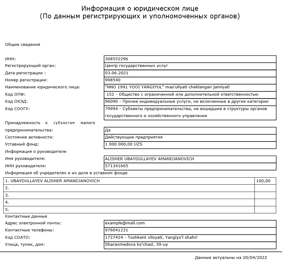 1. Каким образом, не имея договора аренды помещения с Обществом инвалидов, Алишеру Убайдуллаеву удалось зарегистрировать свою фирму по юридическому адресу г. Янгиюль, ул. Шарахмедова 39?