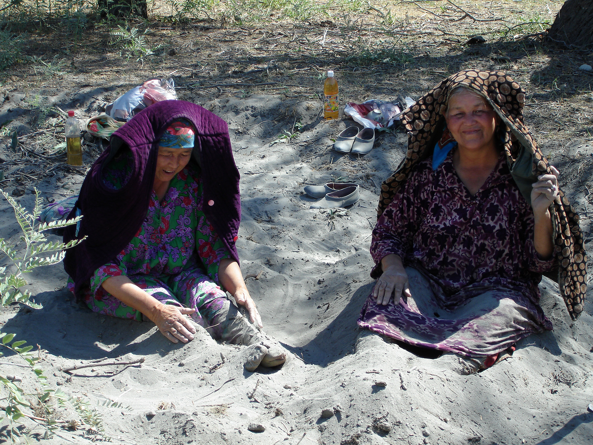 В Зарафшанском заповеднике. Женщины греются в горячем песке для лечения ревматизма