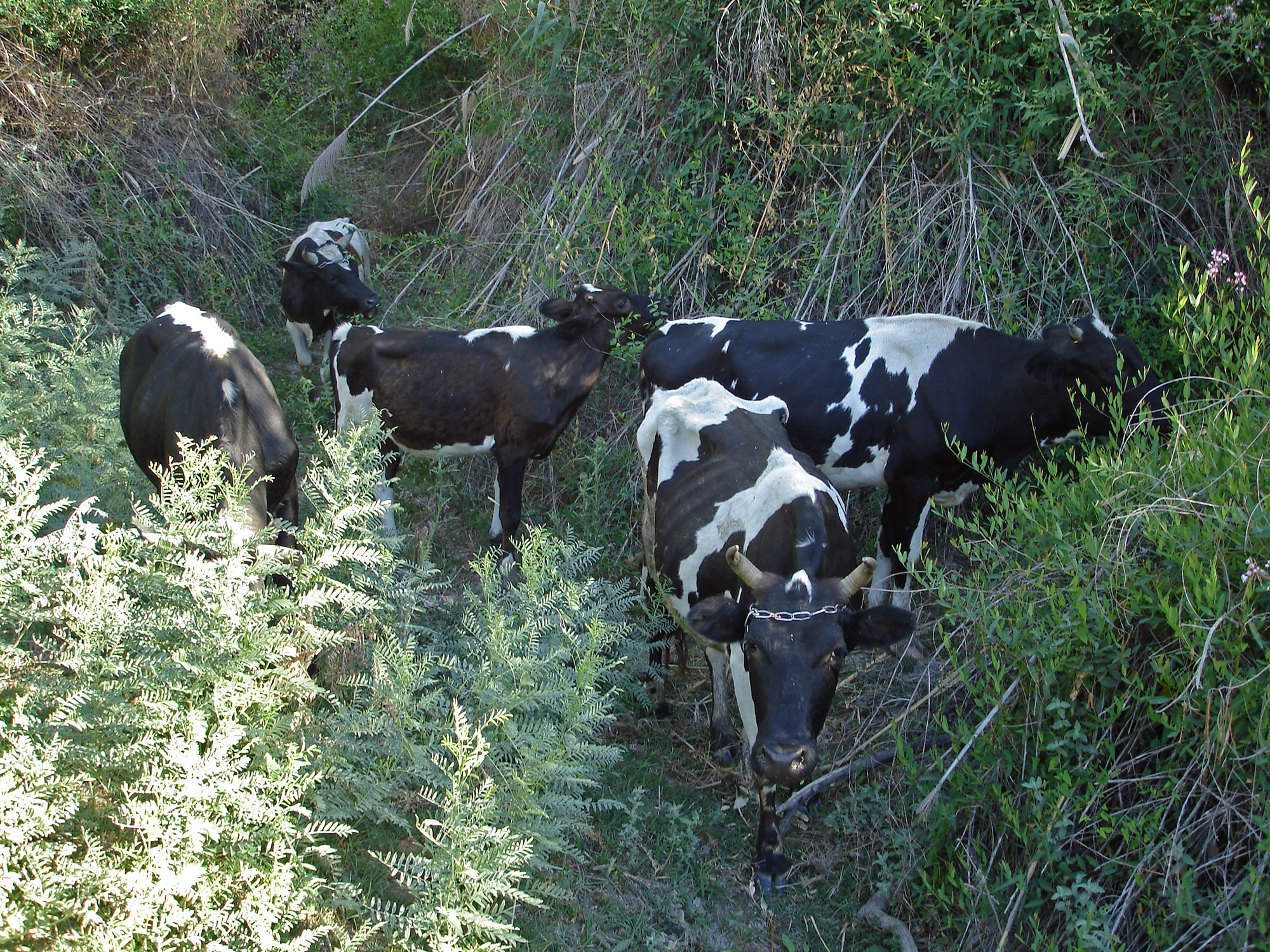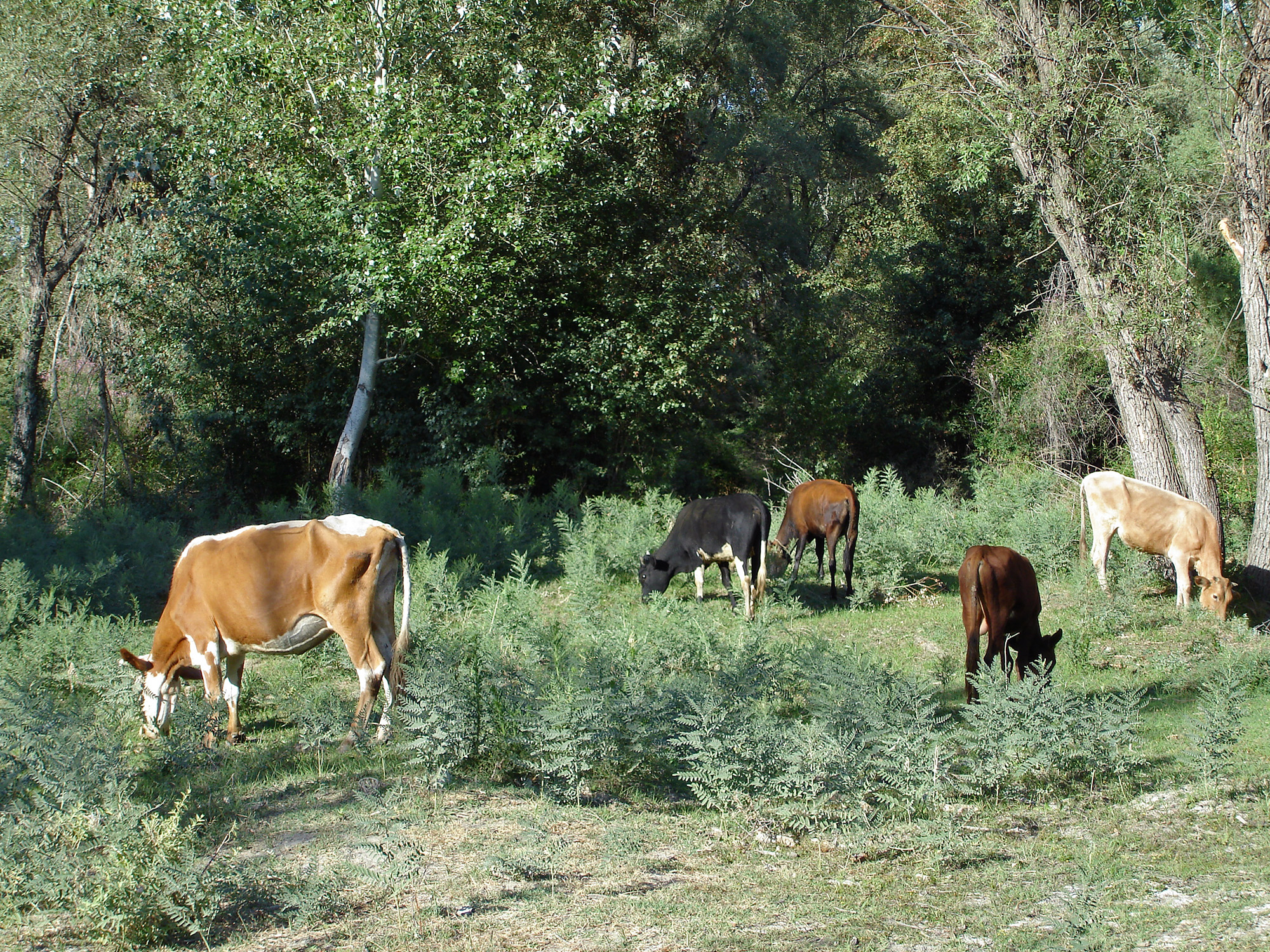 Время от времени встречаются коровьи стада, насчитывающие до десятка голов. Вообще-то скот загоняют сюда с обеих сторон заповедника, в том числе переправляют из-за реки, но в этом году река многоводная, бурная, и по этой причине с того берега Зеравшана скота пригоняют меньше, чем обычно.