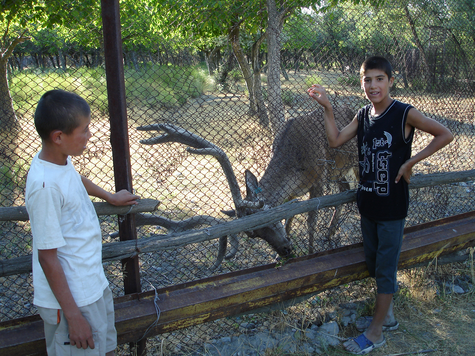 ..Уже вечерело, когда мы повстречали возле вольеров с оленями ватагу местных ребят. Через дырку в сетке они просовывали веточки азиатского тополя, которые олени считают настоящим деликатесом, и с интересом наблюдали, как один из них, подойдя вплотную, поглощает это лакомство. Они смотрели на оленя с почтением и симпатией, явно не как на потенциальный кусок калорий. И в это же время всего в нескольких сотнях метров от вольера их сверстники пасли скот и рубили деревья. Кем будут эти школьники, когда вырастут и станут взрослыми - теми, кто истребляет природу, кому она глубоко безразлична? Хочется верить, что нет...