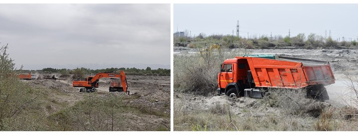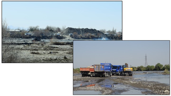Обход совершался на фоне грохота и гула, которые шли со стороны реки. Когда же мы спустились к Зеравшану, то ужаснулись. По побережью со стороны нацпарка спокойно ездили груженые гравием и песком огромные грузовики, которые отходили от работающего тут же экскаватора.