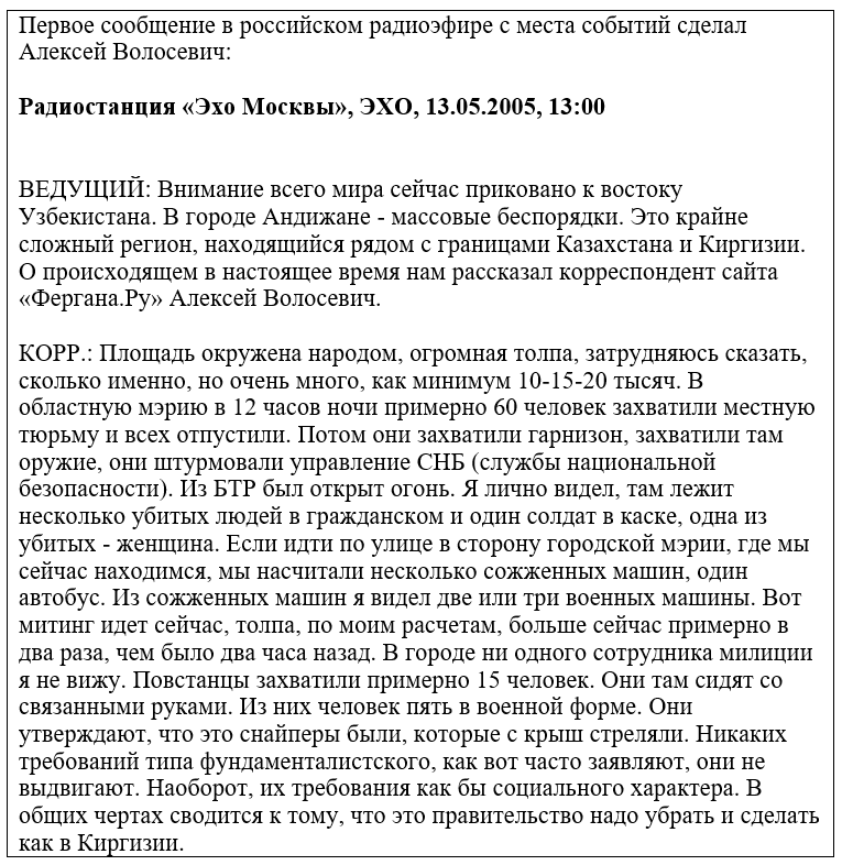 Рано утром на нас обрушился шквал телефонных звонков. «В Андижане совершено нападение на военную часть, из тюрьмы выпущены зэки, горит театр, областной хокимият захватили вооруженные люди!», - таково было содержание тревожных сообщений наших коллег, принятых нами сначала за неуместный розыгрыш. Мы поняли, что случилось нечто, спешно оделись и вышли на улицу. Было начало девятого утра.