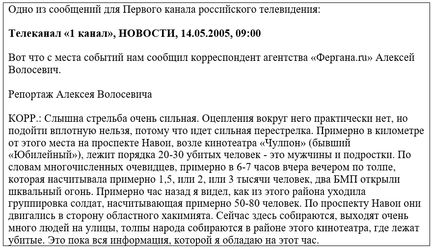«В начале шестого мимо площади пронесся БТР с грузовиком. Толпа пришла в возбуждение. Через несколько минут к площади начал приближаться еще один грузовой «Урал». Мы с Мухаммадшарифом стояли возле хокимията. Видя все это дело, я предложил от греха подальше пересечь площадь по диагонали, наивно полагая, что нам удастся понаблюдать за развитием ситуации с безопасного места. Как только мы ступили на тротуар, злополучный грузовик остановился метрах в пяти от нас. Солдаты с платформы, в бронежилетах и касках, тут же открыли огонь из АКМ в обоих направлениях - в сторону площади и по нам на тротуаре. Стреляли по людям на поражение! Мы бросились на асфальт. Через минуту-другую стрельба утихла, и грузовик медленно отъехал. В трех метрах от меня на спине лежал мужчина с простреленной головой. Из-под его затылка на асфальте уже запекся ручеек крови. Пригибаясь, мы забежали за угол, в переулок. Народ в панике валил с площади. Оттуда доносились непрекращающиеся автоматные очереди, в небо поднимались два столба черного дыма. И тут, минут через 15-20, слышим оглушительную стрельбу, и видим: из переулка на нас надвигается БТР. Бежим с группой молодых людей к боковым воротам парка, благо они оказались открытыми. Там мы оглянулись и насчитали еще пять грузовиков с солдатами, следующих за этим БТР в направлении площади. Похоже, пока мы бежали через парк, стреляли и по нам. Во всяком случае, хлопки от автоматных очередей слышались совсем рядом, хотя вся заваруха творилась уже далеко от нас...».
