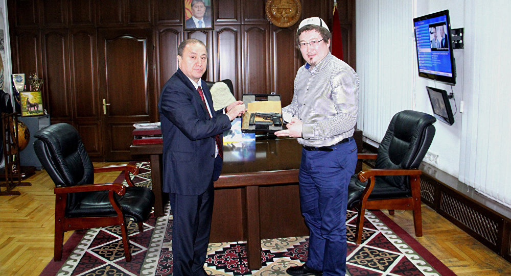 Министр внутренних дел Кыргызстана вручает Маликову оружие для самообороны
