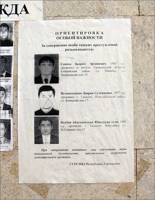 В первой половине сентября практически все общественные места Ташкента оказались заклеены розыскными ориентировками «особой важности», содержащими изображения, в общей сложности, 33 человек и снабженными припиской о том, что их разыскивают за совершение особо тяжких преступлений и что при их задержании необходимо соблюдать меры повышенной безопасности, поскольку «преступники вооружены огнестрельным оружием».