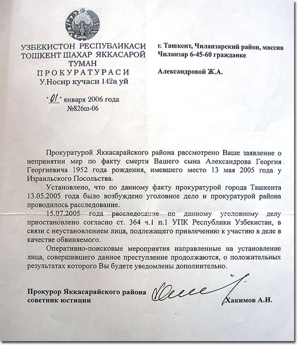 Чтобы выслушать версию другой стороны я попытался встретиться с кем-либо из имеющих отношение к этому делу лиц и организаций. В приемной израильского посольства, когда я позвонил туда, меня попросили подождать, оставаясь на линии. Затем с кем-то переговорили и ответили, что за информацией мне следует обратиться в компетентные органы, а посольство комментариев давать не будет. Следователь Улугбек Сулейманов оказался вне всякой телефонной досягаемости. А прокурор Яккасарайского района А.Хакимов, у которого мне очень хотелось выяснить, что означает написанная им фраза «в связи с неустановлением лица, подлежащего привлечению к делу в качестве обвиняемого», встречаться со мной отказался и передал через дежурную охрану, чтобы за разъяснениями я обращался в городскую прокуратуру.