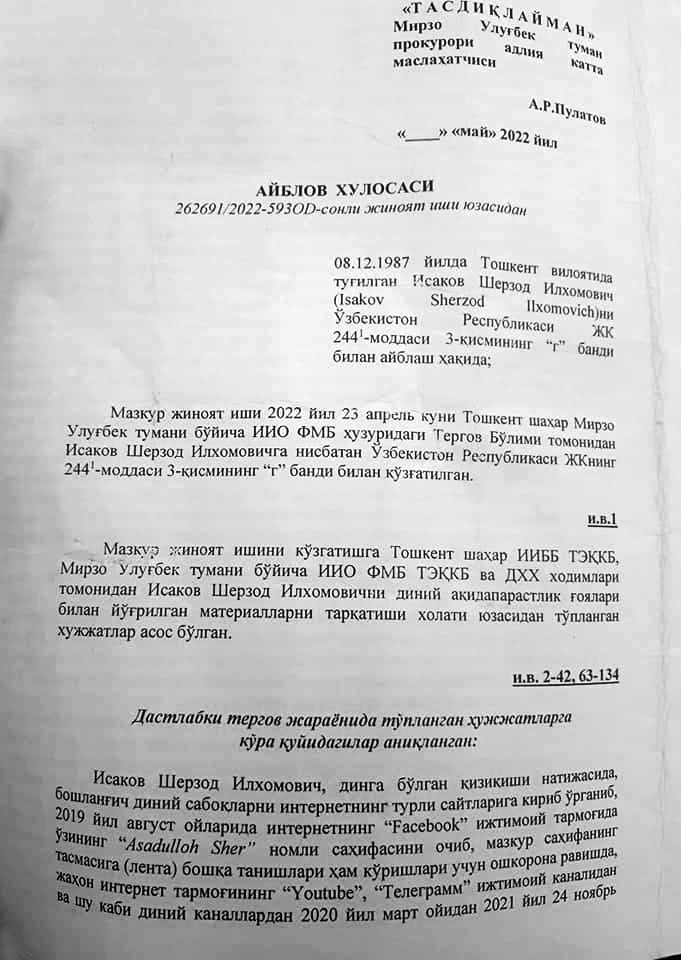 «Житель Ташкента Ш. И. (Шерзод Исаков – ред.) в апреле месяце был взят под стражу по обвинению в распространении выступлений религиозного деятеля Аброра Мухтара Али и других, а позже на основании ходатайства был отпущен на свободу. В отношении него было составлено обвинительное заключение, согласно 3-й части статьи 244 («Незаконное изготовление, хранение, ввоз на территорию Республики Узбекистан с целью распространения материалов религиозного содержания») УК РУз. У меня нет никаких сомнений относительно того, что суд узаконит данное обвинение», - написал правозащитник 17 июля. (Здесь и далее все цитаты переведены с узбекского.)