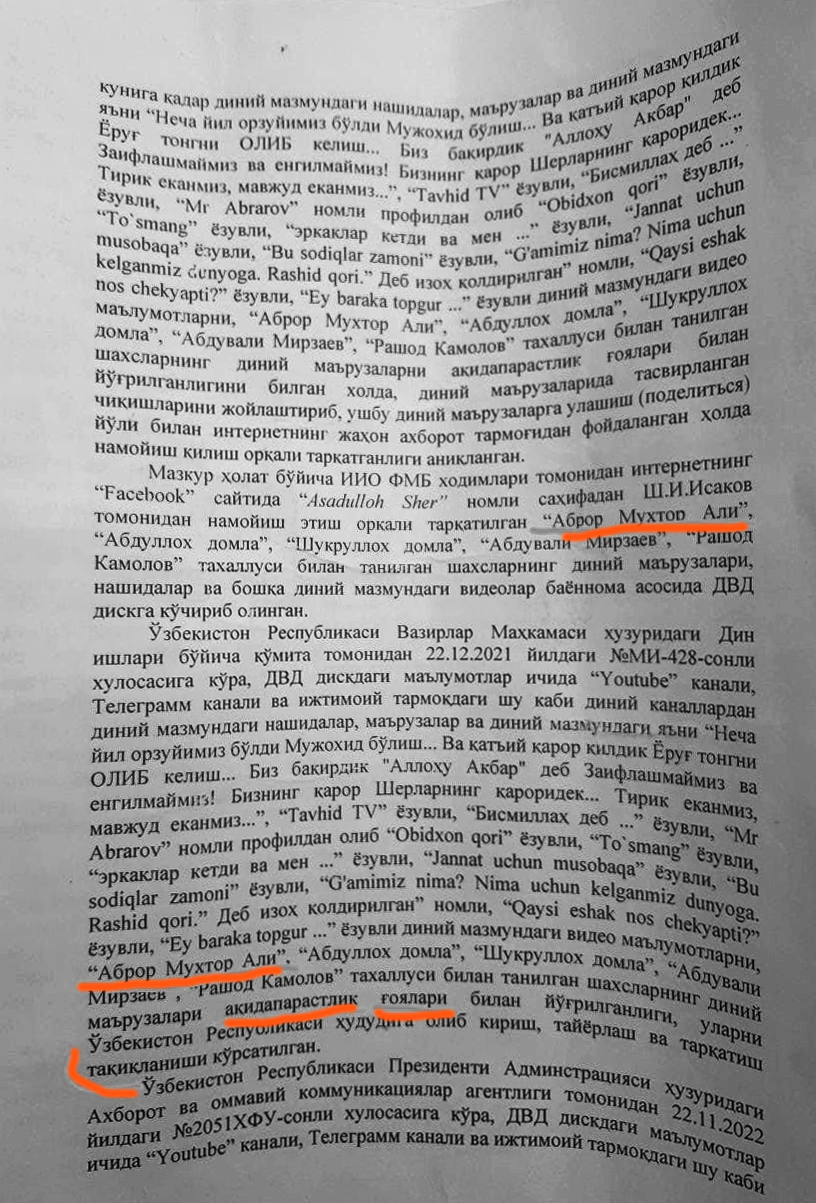 «В обвинительном заключении (…) написано, что проповеди Аброра Мухтара Али «пронизаны радикально-фанатическими идеями, и их запрещено ввозить на территорию Узбекистана и распространять». Что творится, уважаемые? Голова пухнет. Как вы думаете, это техническая ошибка или Аброр уже успел занять место в списке экстремистов?»;