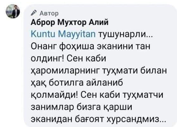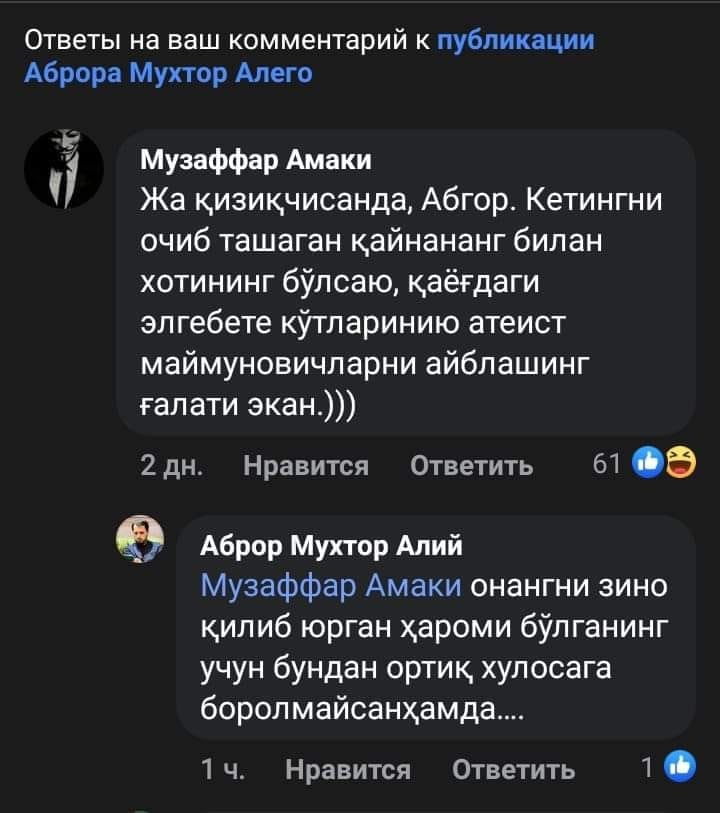 «Этот пост был написан [исключительно] с целью предотвращения неправильного толкования высказываний наших уважаемых проповедников и во избежание их втягивания в уголовные разбирательства. Однако несколько минут назад мне позвонил герой моего поста Аброр [Мухтар Али] и сразу перешел к оскорблениям, пригрозив разместить нашу с ним [телефонную] беседу в соцсетях (что он и сделал – ред.). Пусть поступает как знает. Но я даже предположить не мог, насколько он, оказывается, низкий [человек] и болен психически!» - прокомментировал позже действия своего «духовного» оппонента обомлевший правозащитник.