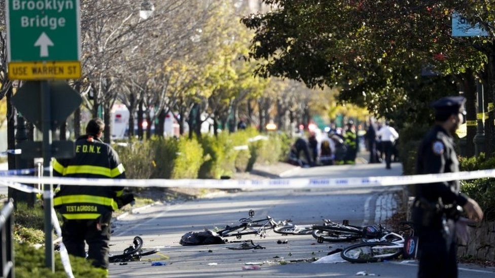По сообщениям американских властей, около трех часов дня белый пикап въехал на Манхэттен через туннель под Гудзоном и помчался на юг по идущей вдоль шоссе широкой велодорожке, давя велосипедистов и пешеходов, которых там было немало в этот солнечный день, затем он врезался в школьный автобус и остановился.