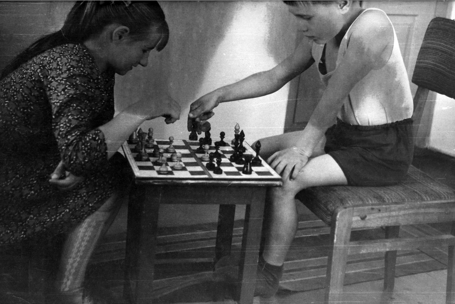 Нина Веккерле (слева) играет с братом в шахматы. Ангрен, 1969 год