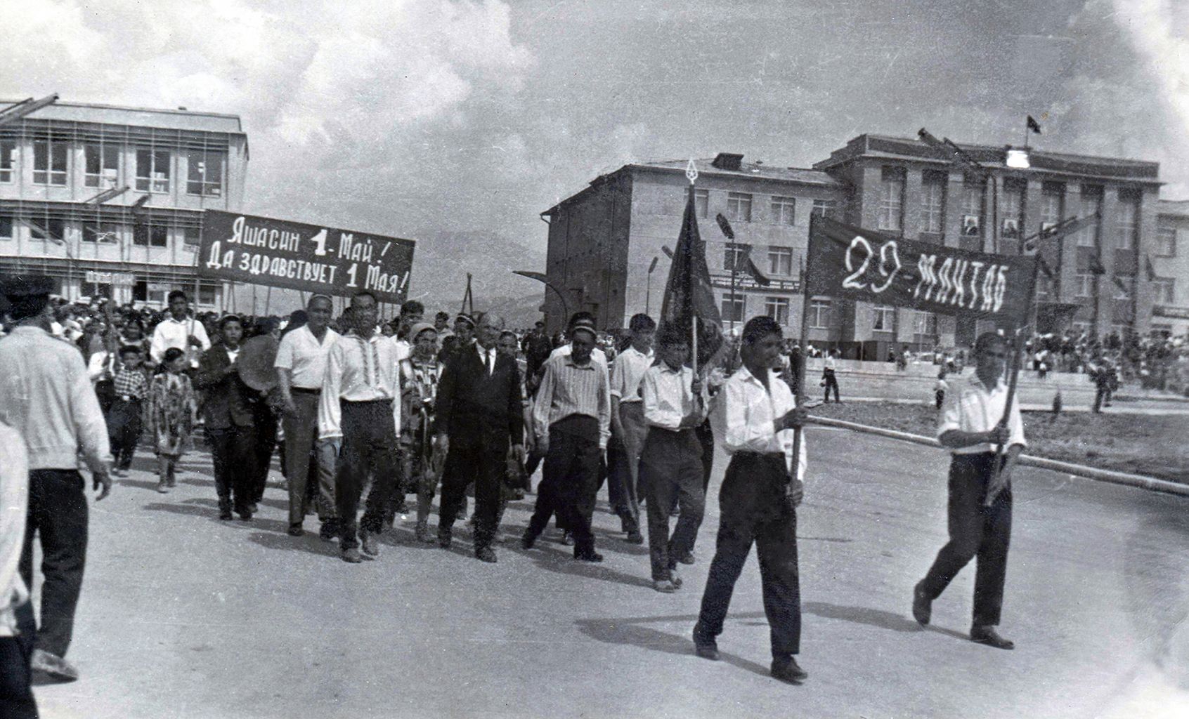 Евгений Васильевич Веккерле (в центре в костюме) на демонстрации в Ангрене, 1960-е или 1970-е годы