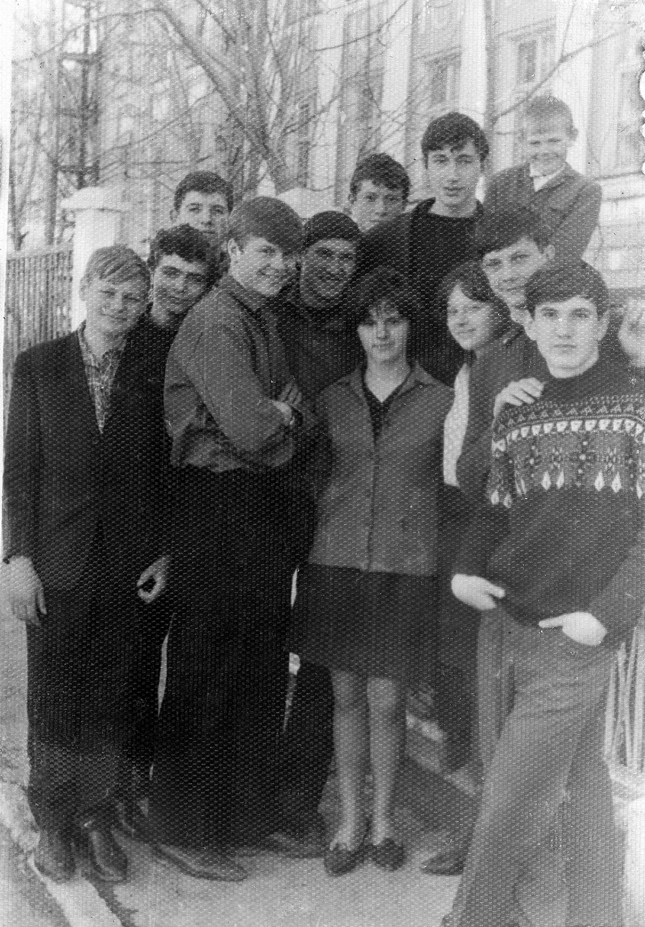 Валерий Гросс (третий справа) с одноклассниками перед зданием школы. Янгиабад, середина 1960-х
