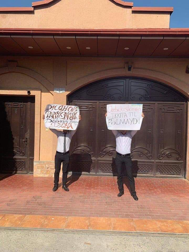 Надпись на плакате: «Государственный язык в Узбекистане – узбекский язык».