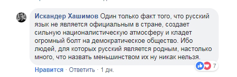 По его мнению, «поколение, выросшее в советские годы, благодаря проводимой тогда в Советском Союзе образовательной, национальной и языковой политике, было вынуждено владеть русским языком, чтобы иметь доступ к образованию». «Но, возможно, единственное положительное воздействие, которое я ощутил от прочтения этого, по всем иным показателям вредного манифеста, для меня было осознание того, до какого плачевного состояния мы довели положение нашего государственного языка, если такие экстремальные и вздорные идеи и предложения могут кому-то представляться приемлемым выходом из него», - высказался Хашимов.