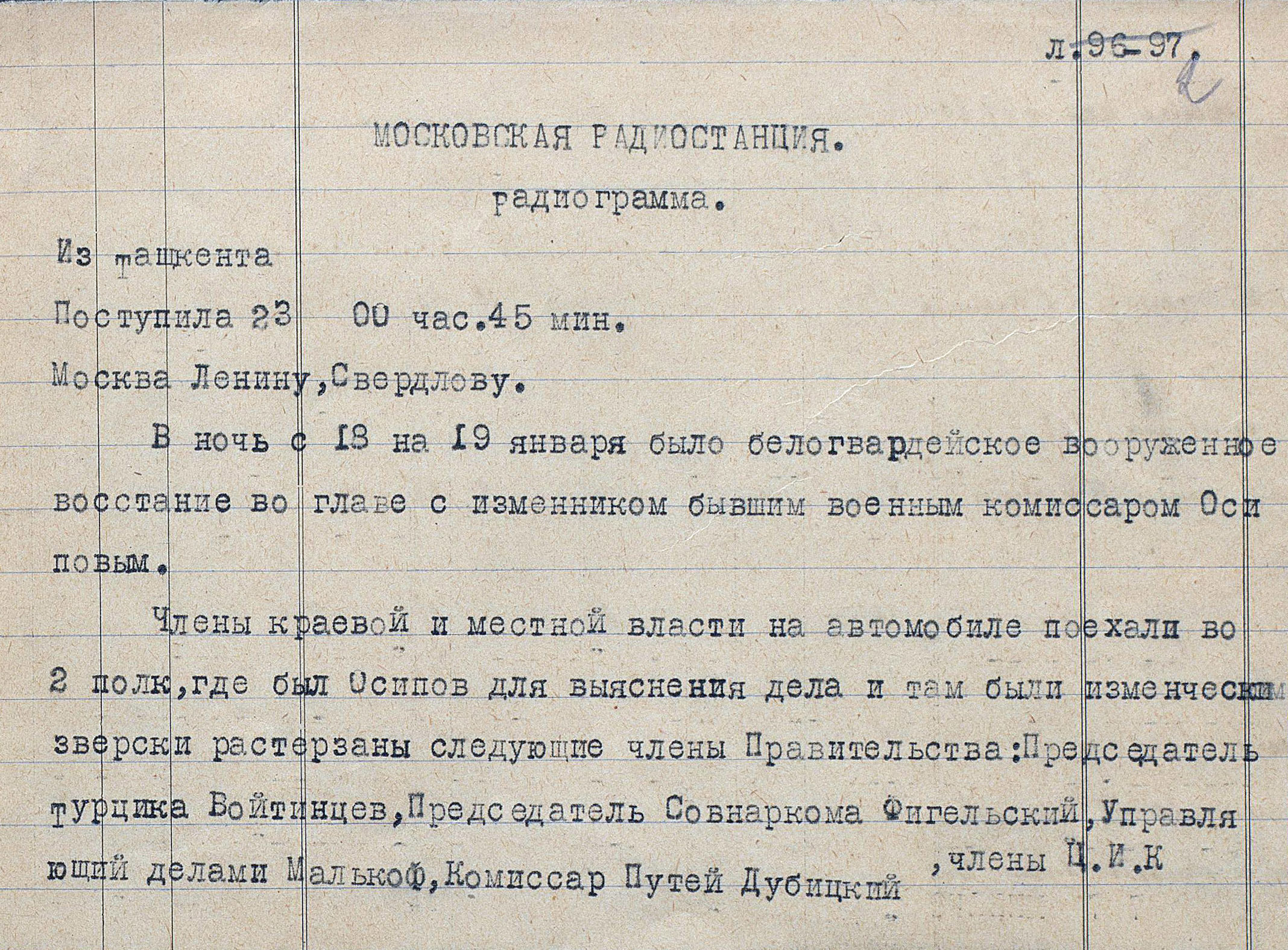 Члены краевой и местной власти на автомобиле поехали во 2 полк, где был Осипов для выяснения дела и там были изменнически зверски растерзаны следующие члены правительства: Председатель Турцика Войтинцев, Председатель Совнаркома Фигельский, Управляющий делами Малькоф, Комиссар путей Дубицкий, члены Ц.И.К Червяков, Председатель чрезвычайной следственной комиссии Фоменко, Председатель ташкентского совета Шумилов, товарищ председателя Финкельштейн, член Совета Першин, Председатель Совета профсоюзов Качуринер, помощник охраны города Лугин, член комиссариата Турпути Грищенко. Все переименованные коммунисты. В защиту советской власти первым выступил отряд товарища Колузаева, Школа военных инструкторов, Четвертый Советский полк, совместно с железнодорожниками и другими рабочими и гарнизон крепости во главе с товарищем Беловым. 20 го в 6 часов утра общими силами было сделано наступление на белогвардейскую банду, возглавляемую Осиповым, была открыта орудийная и ружейная пальба из мастерских и из крепости по второму полку, где был штаб Осипова. Наступление продолжалось до 7 часов вечера, после чего белогвардейцы, теснимые со всех сторон, начали отступать. При отступлении в их руках оставались банки и Центральный телеграф. В три часа ночи оставшиеся части Осипова отступили в сторону станицы Урсатьевская с одним грузовиком и двумя орудиями, и несколькими пулеметами и с похищенными из банка деньгами и ценностями. Сумму похищенного выяснить не удалось, меры к поимке предприняты. В городе порядок восстанавливается. Буржуазия ликовала хождением с флагами «за Учредительное Собрание», обещая хлеб и керосин. Восстание ликвидируется головами буржуазии. За кровь лучших товарищей отплатим кровью буржуазии. Власть восстанавливается объединенными оставшимися членами ЦИК, Совкома и Исполкома. Организован ввиду выбытия членов правительства до 7 Съезда Советов временно Революционный Совет из 14 человек. Председателем избран Компрод Казаков. Съезд должен состояться не позже 1 марта. Во время занятия города белогвардейцами были изданы приказы, что Советская власть свергнута и до созыва Учредительного Собрания учреждается военная диктатура. Извещается поздно, потому, что главы правительства уничтожены, а оставшиеся были на баррикадах, но условная была подана за подписью Компрод Казакова.
