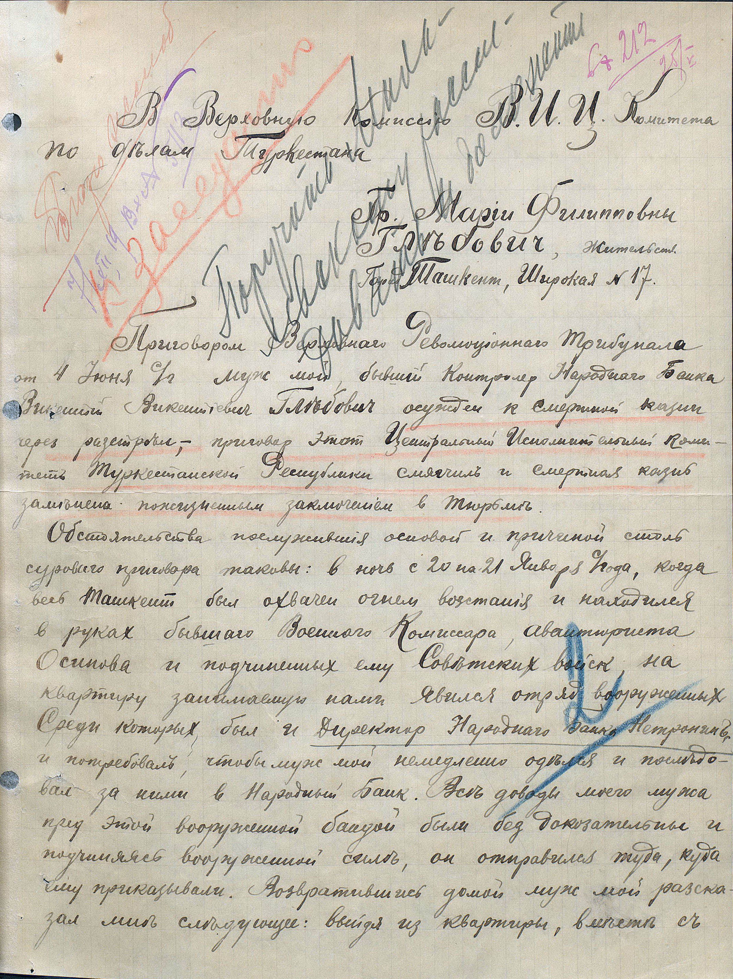 Приговором Верховного Революционного Трибунала от 4 июня с/г муж мой, бывший контролёр Народного Банка Викентий Викентьевич Глебович осужден к смертной казни через расстрел, - приговор этот Центральный Исполнительный комитет Туркестанской Республики смягчил и смертная казнь заменена пожизненным заключением в тюрьме.