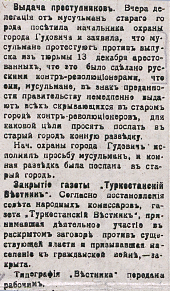 Вчера делегация от мусульман старого города посетила начальника охраны города Гудовича и заявила, что мусульмане протестуют против выпуска из тюрьмы 13 декабря арестованных, что это было сделано русскими контр-революционерами, что они, мусульмане, в знак преданности правительству немедленно выдают всех скрывающихся в старом городе контр-революционеров, для каковой цели просят послать в старый город конную разведку.