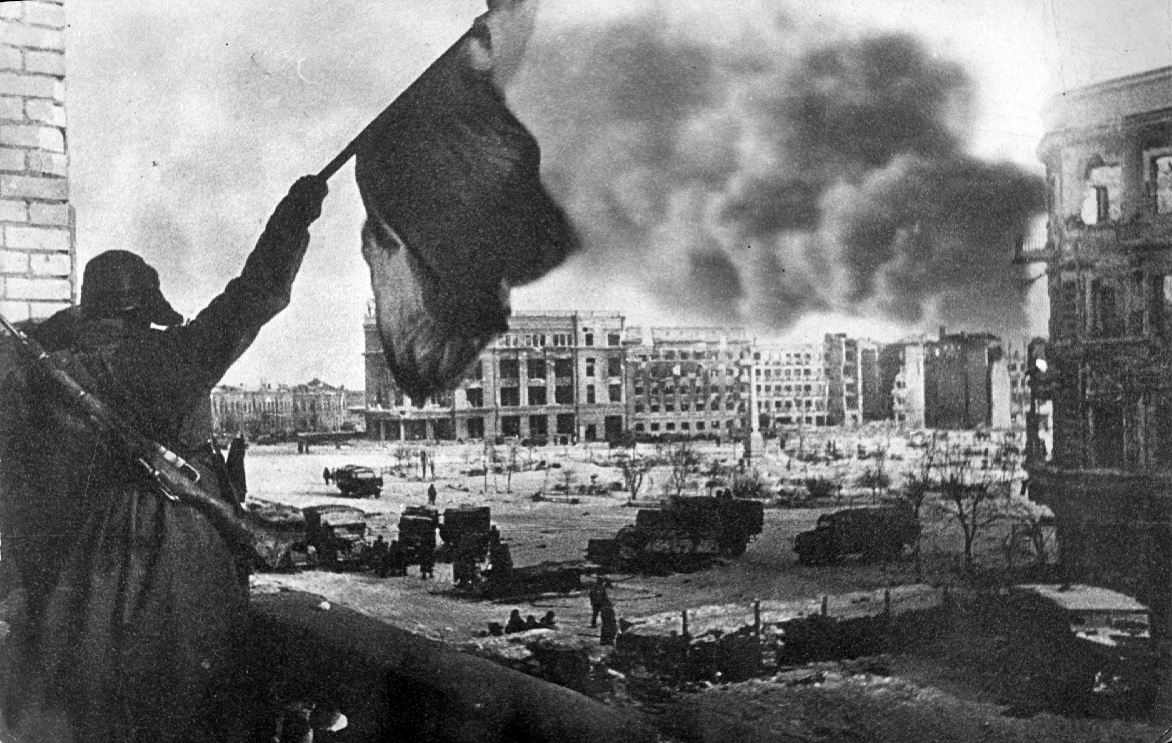 Советский солдат машет красным флагом на центральной площади Сталинграда, январь-февраль 1943. Фото Георгия Зельмы