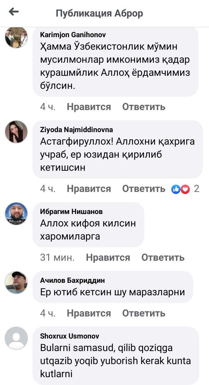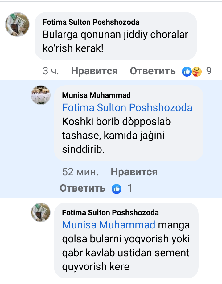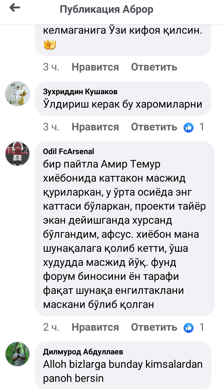 «Надо убить эту нечисть»; «Я так радовался, когда в одно время говорили, что на территории [сквера] эмира Тимура будет воздвигнута мечеть...»
