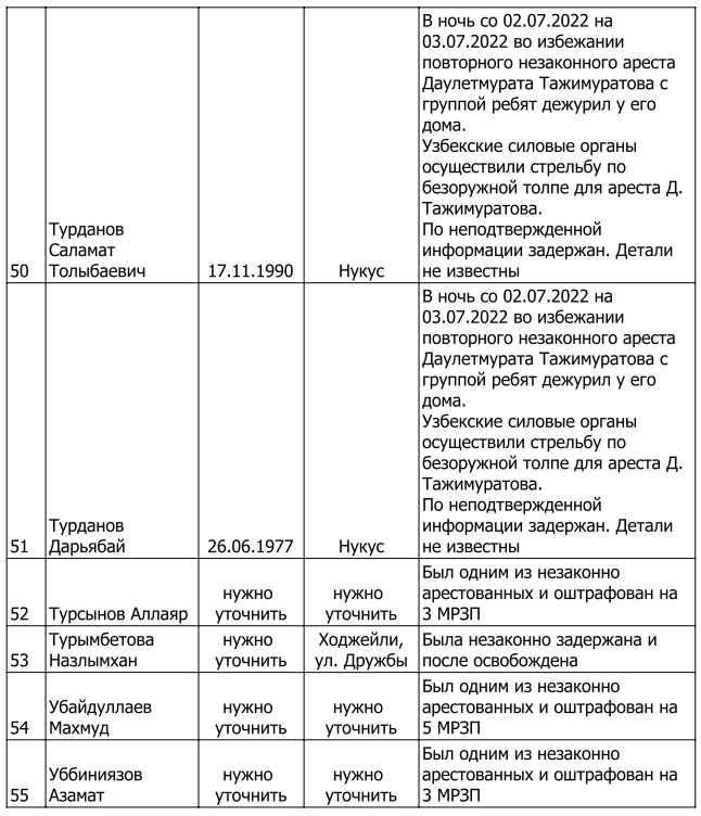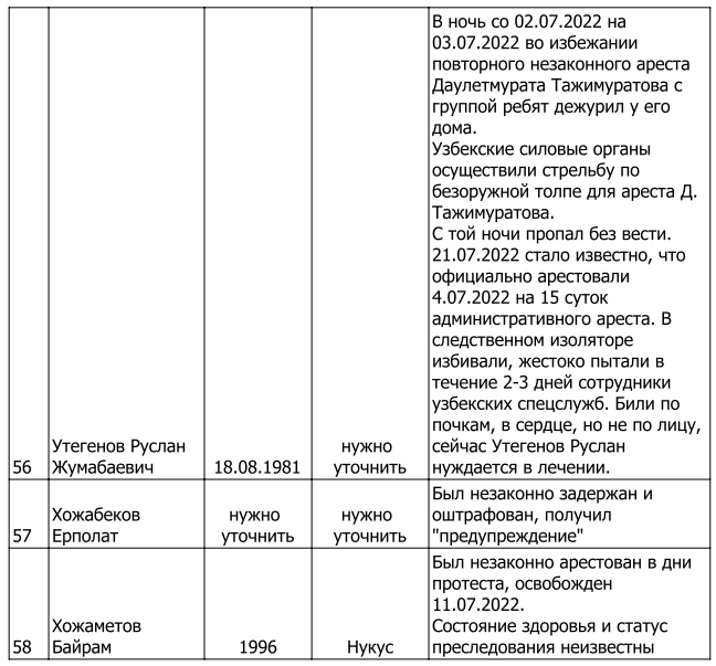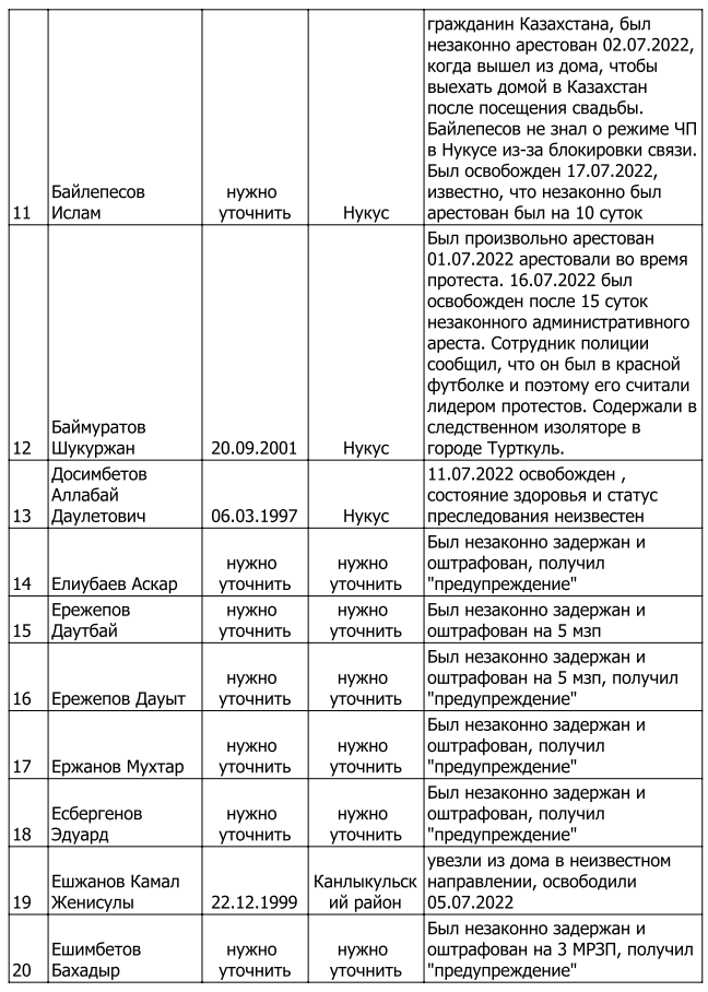 Список освобожденных участников мирных протестов и мирных жителей Каракалпакстана по состоянию на 5 августа 2022 г.