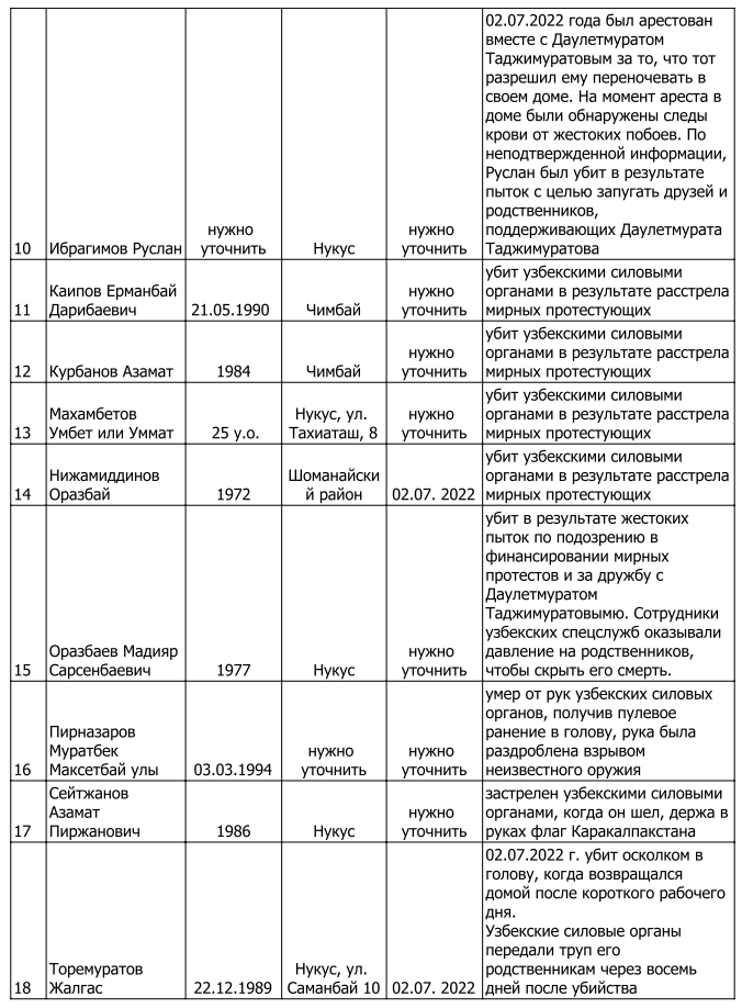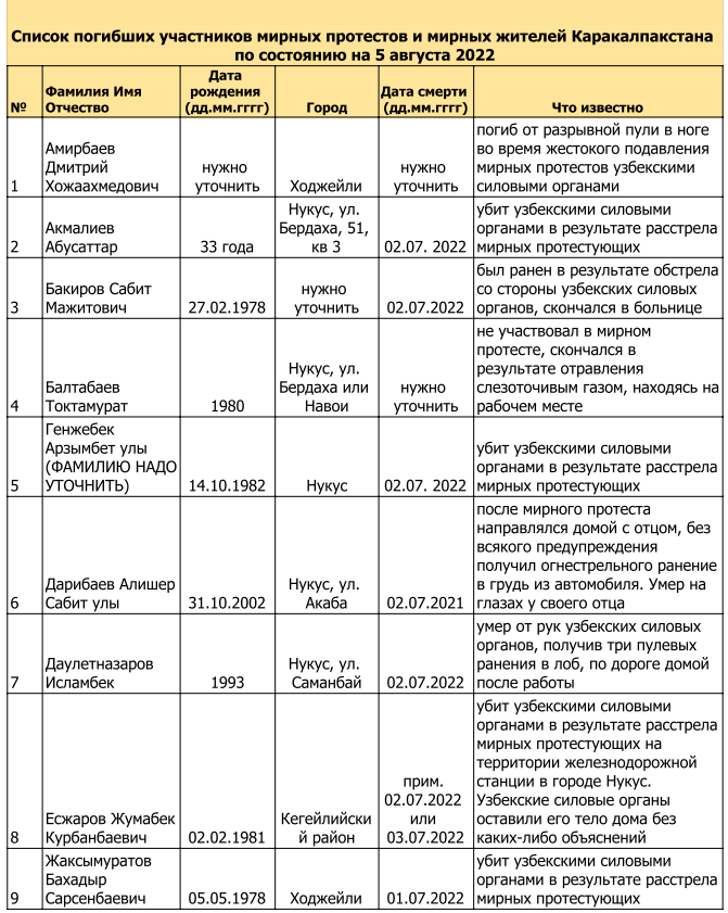 Список погибших участников мирных протестов и мирных жителей Каракалпакстана по состоянию на 5 августа 2022 г.