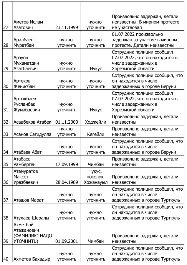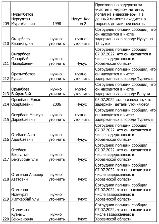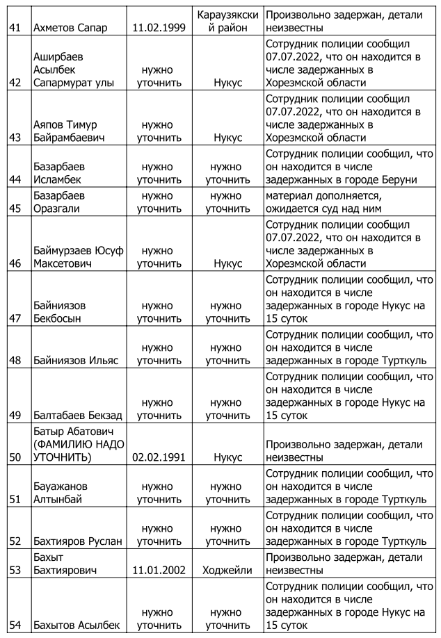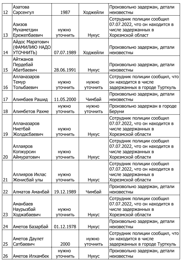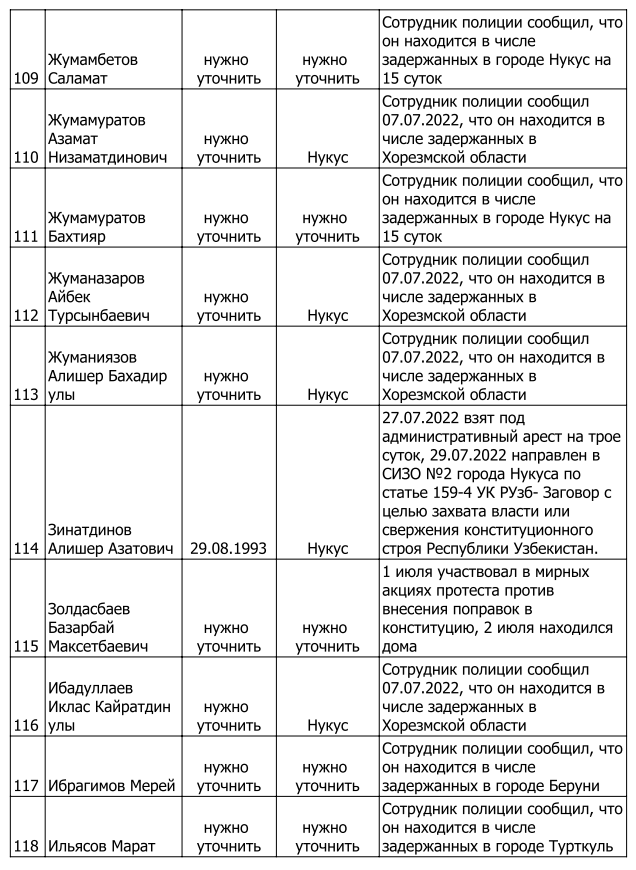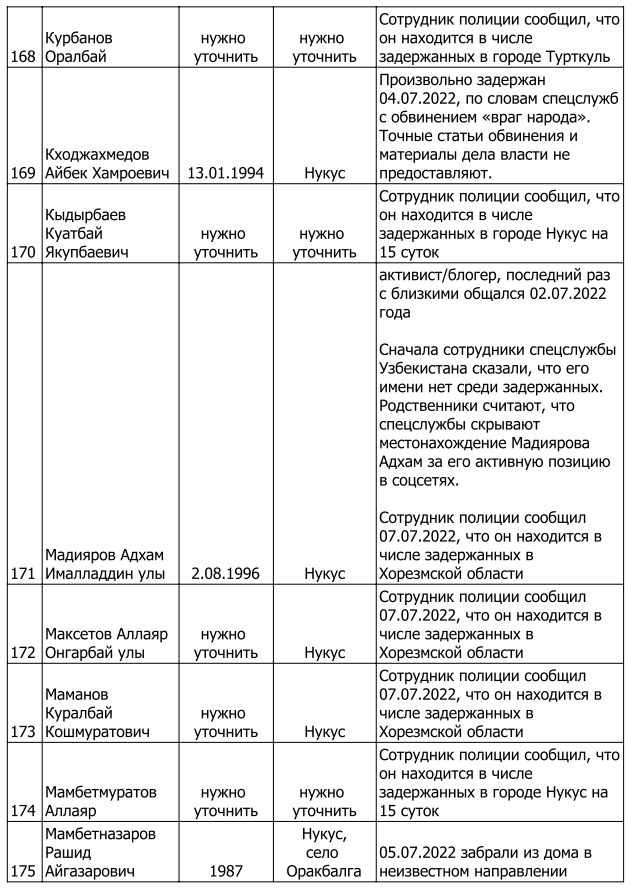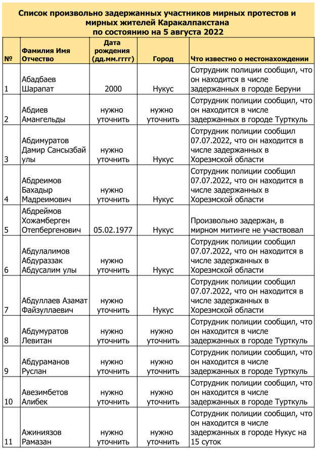Список произвольно задержанных участников мирных протестов и мирных жителей по состоянию на 5 августа 2022 г.