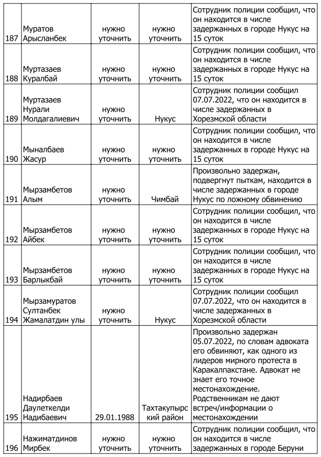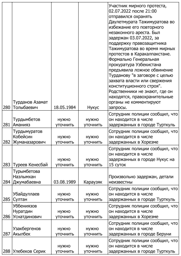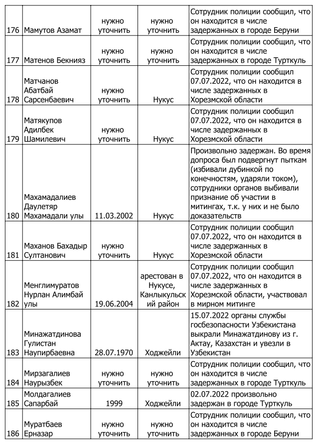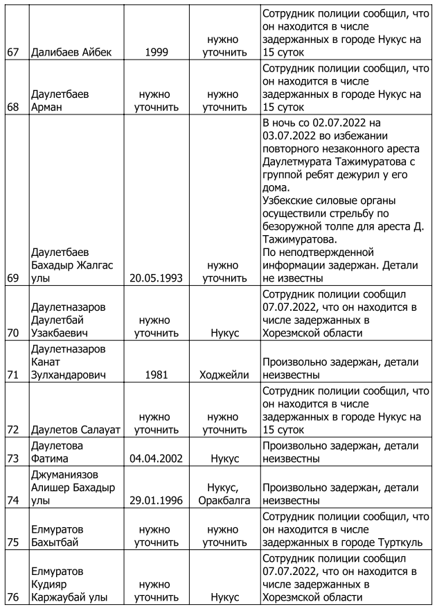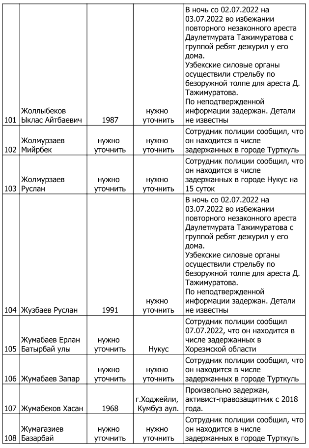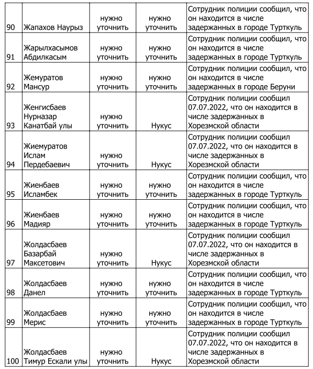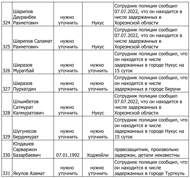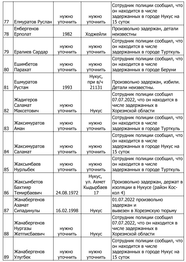 Список произвольно задержанных участников мирных протестов и мирных жителей по состоянию на 5 августа 2022 г.