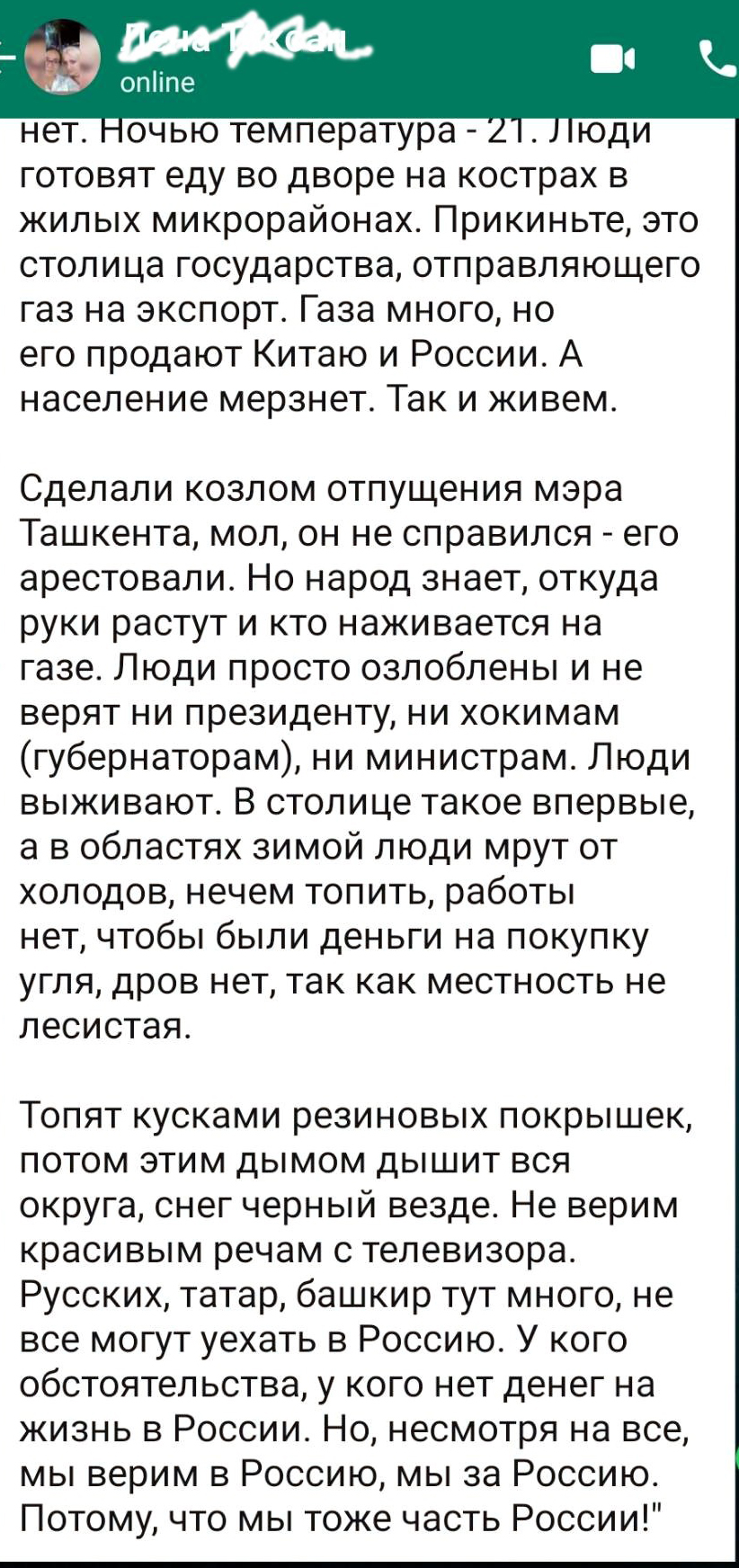 Вчера я получил сообщение от двоюродной сестры, проживающей в Великобритании, точнее, она переслала распространяющееся в WhatSapp’e письмо некого человека о текущей энергетической ситуации в Узбекистане (не буду полностью приводить текст - это отнимет время). Всё там перечисляется: и отсутствие горячей воды, и отопления, и газа, отключение электричества, и обещание чиновников всё утрясти, то есть полное негодование по поводу возникшей проблемы. Но при этом делается неожиданное заявление, и я его повторю, поскольку именно оно является самым важным в этом сообщении: «Не верим красивым речам из телевизора. Русских, татар, башкир тут много, не все могут уехать в Россию. У кого обстоятельства, у кого нет денег на жизнь в России. Но, несмотря на всё, мы верим в Россию, мы за Россию. Потому, что мы тоже часть России!»