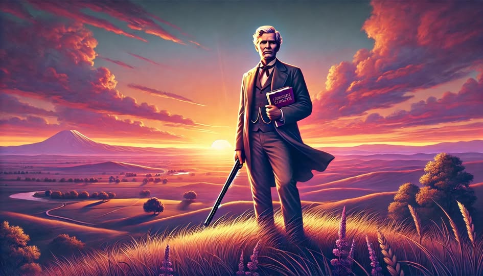 П.С. По моей просьбе ИИ нарисовал рисунок: Фигура Ядгора-ака на фоне заката, символизирующего его уход, с книгой в одной руке (символ интеллекта и знаний), а в другой – охотничье ружье (напоминание о его увлечении охотой).
