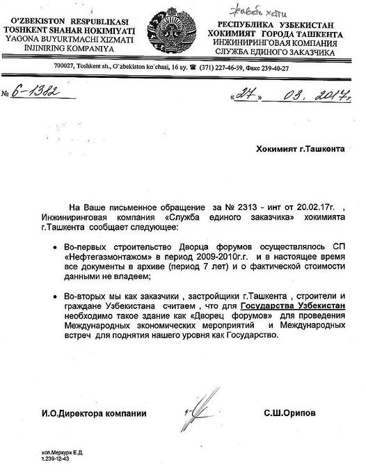 На мое письмо Ташкентский хокимият нагло заявил, что не знает, во сколько обошелся госбюджету Дворец.